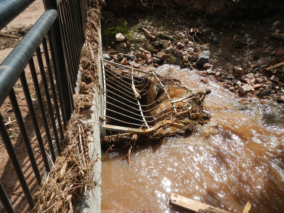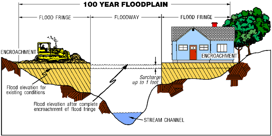 “...means the channel of a river or other watercourse and the adjacent land areas that must be reserved in order to discharge the base flood without cumulatively increasing the water surface elevation more than one foot {or stricter local standard}.”